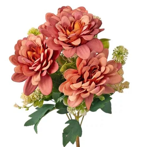 A dália selyemvirág csokor lenyűgöző, 7 ágas kompozíció, amely 36 cm magas, és élethű szépségével bármely enteriőrt feldob. A dús, gazdagon kidolgozott selyemszirmok romantikus és elegáns megjelenést kölcsönöznek a csokornak. Tökéletes választás otthoni dekorációhoz, esküvői díszítéshez vagy időtálló ajándékként. Soha nem hervad el, így hosszú éveken át megőrzi frissességét és kifinomultságát.